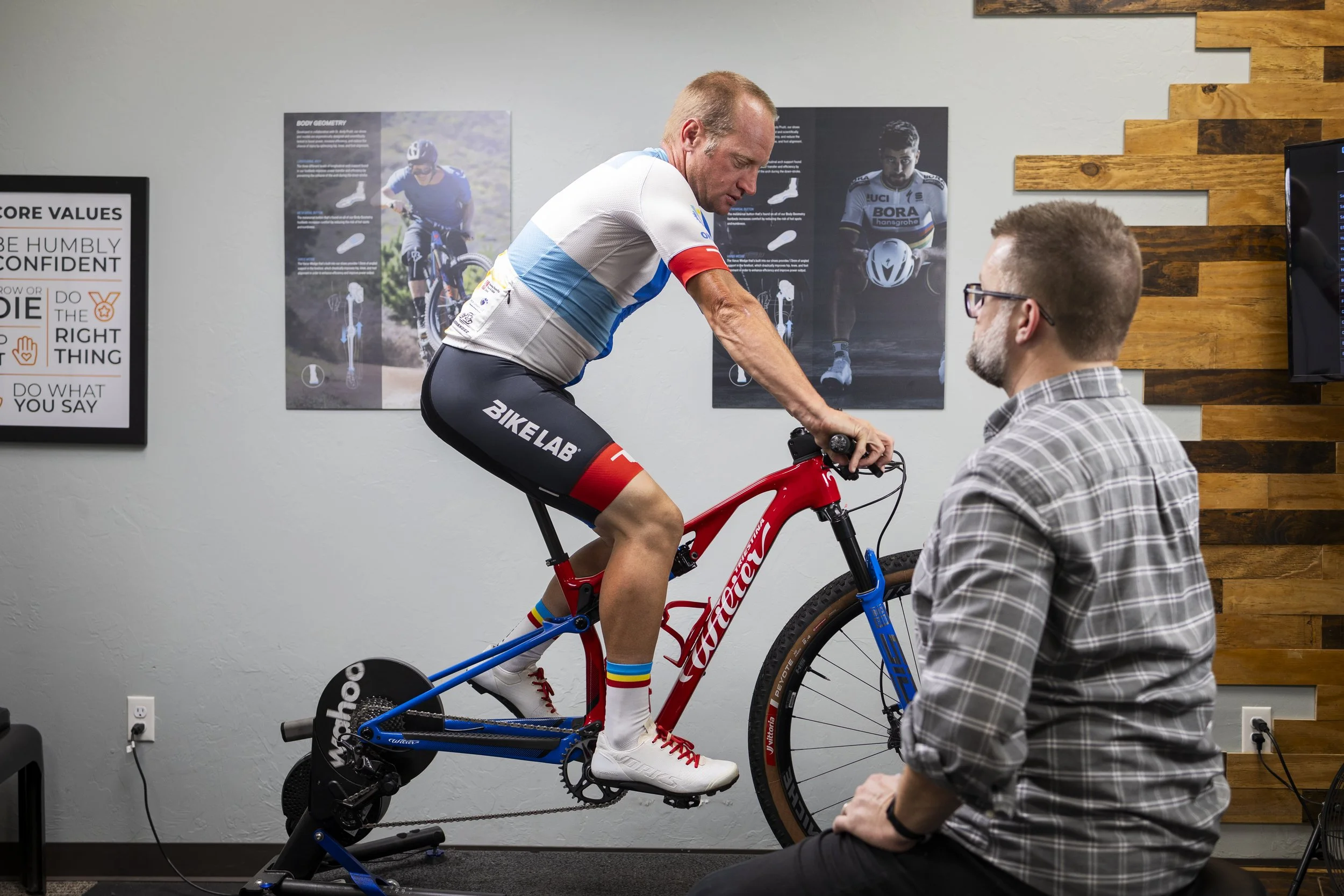 Then we make targeted changes to saddle, cockpit, and cleat/foot alignment and test them as you ride until it feels right and tracks right.